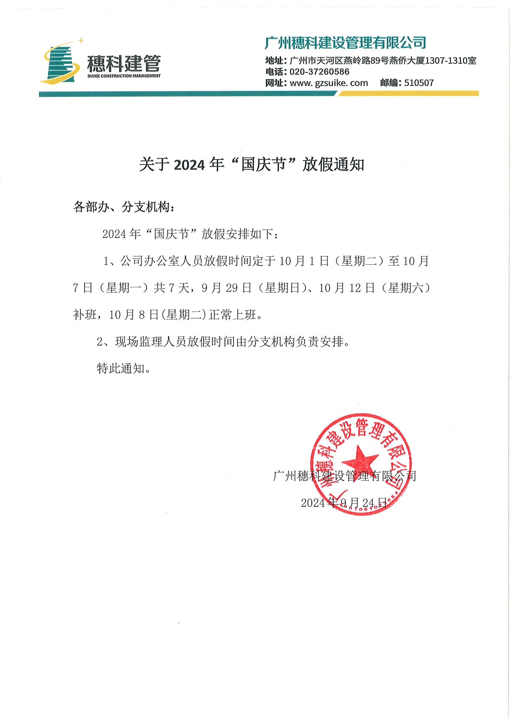 關(guān)于 2024 年“國慶節(jié)”放假通知