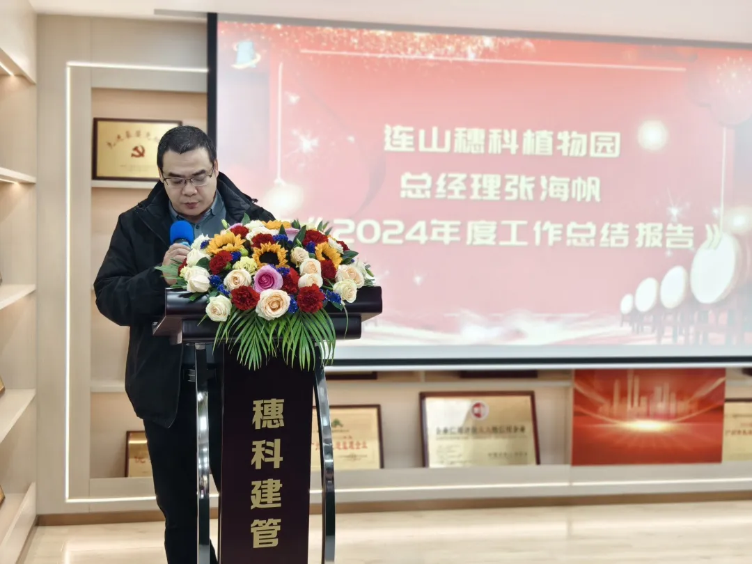 連山穗科植物園總經(jīng)理張海帆作了《2024年度工作總結(jié)報(bào)告》。他從園區(qū)建設(shè)、生產(chǎn)經(jīng)營(yíng)、團(tuán)隊(duì)建設(shè)等方面進(jìn)行了全面理,展示了連山穗科植物園在過(guò)去一年的取得的顯著成績(jī),并作了2025年工作計(jì)劃安排。