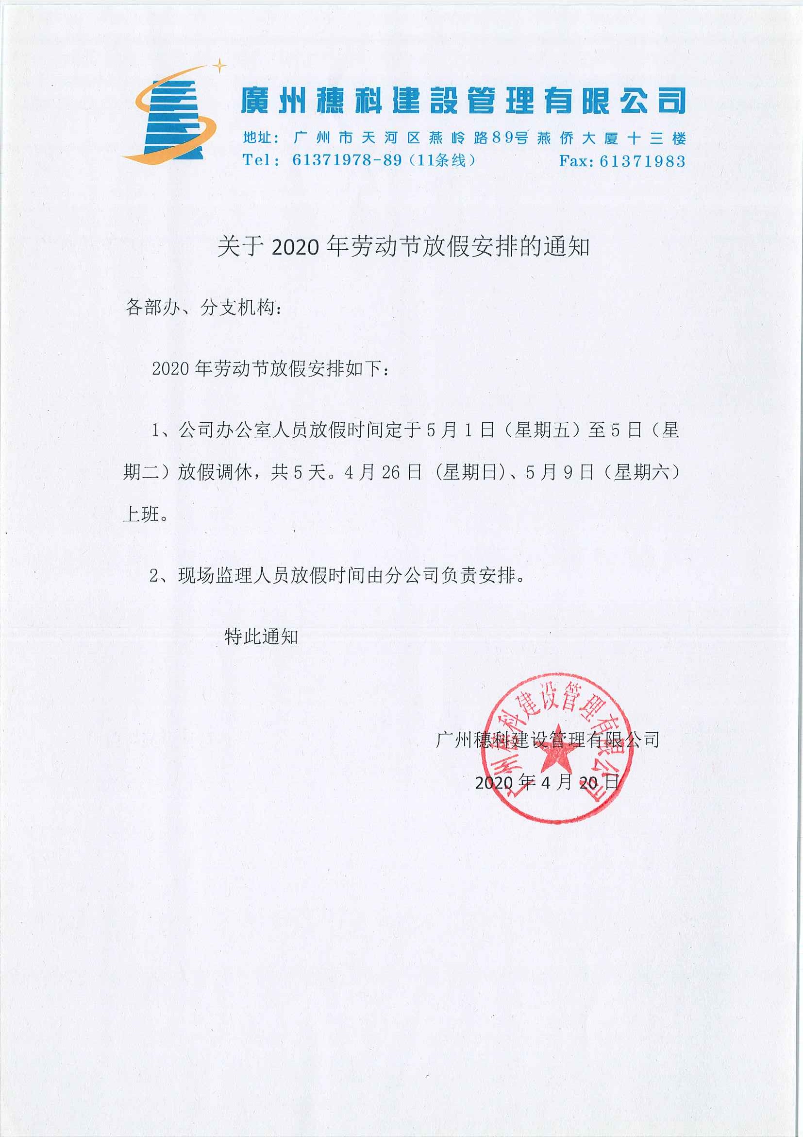 關(guān)于2020年勞動節(jié)放假安排的通知