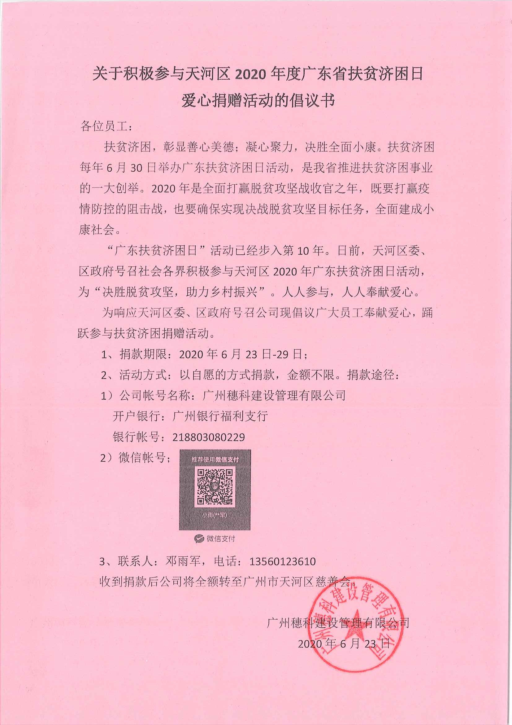 關(guān)于積極參與天河區(qū)2020年度廣東省扶貧濟困日愛心捐贈活動的倡儀書