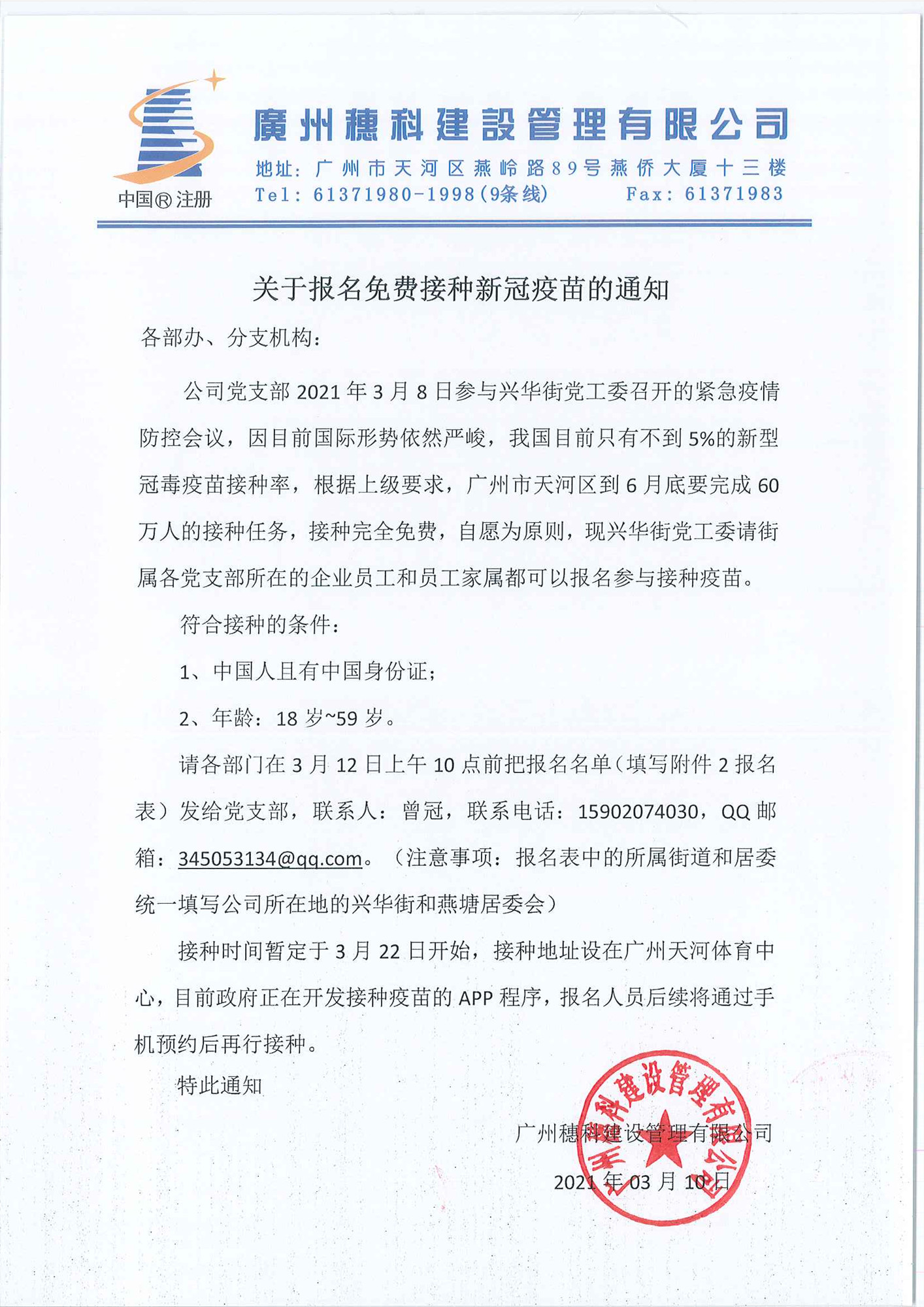 關于報名免費接種新冠疫苗的通知